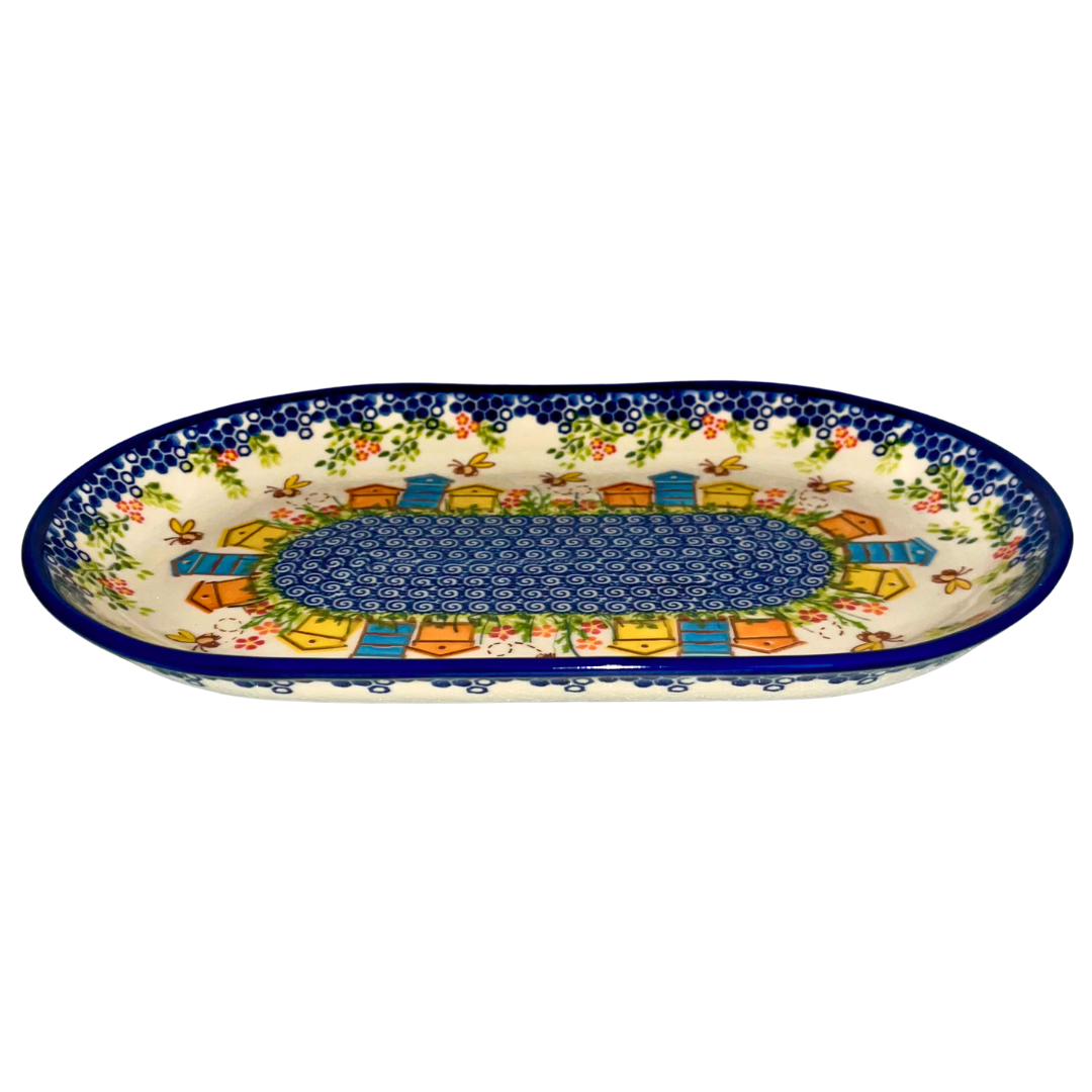 Pattern 1042 Beehives from Ceramika Kalich is a cheerful hand-painted design that celebrates the beauty of nature and the artistry of Polish pottery. Featuring colorful beehives in orange, blue, and yellow, surrounded by buzzing bees, vibrant red blossoms, and leafy green vines, this pattern brings a whimsical charm to any collection. The deep cobalt blue border with honeycomb-inspired accents frames the design beautifully. Crafted in Bolesławiec, Poland, each piece is made from durable, chip-resistant stoneware that is oven, microwave, dishwasher, and freezer safe. Perfect for everyday use or as a unique gift, the Beehives pattern is a delightful way to bring the warmth of handcrafted tradition into your home.