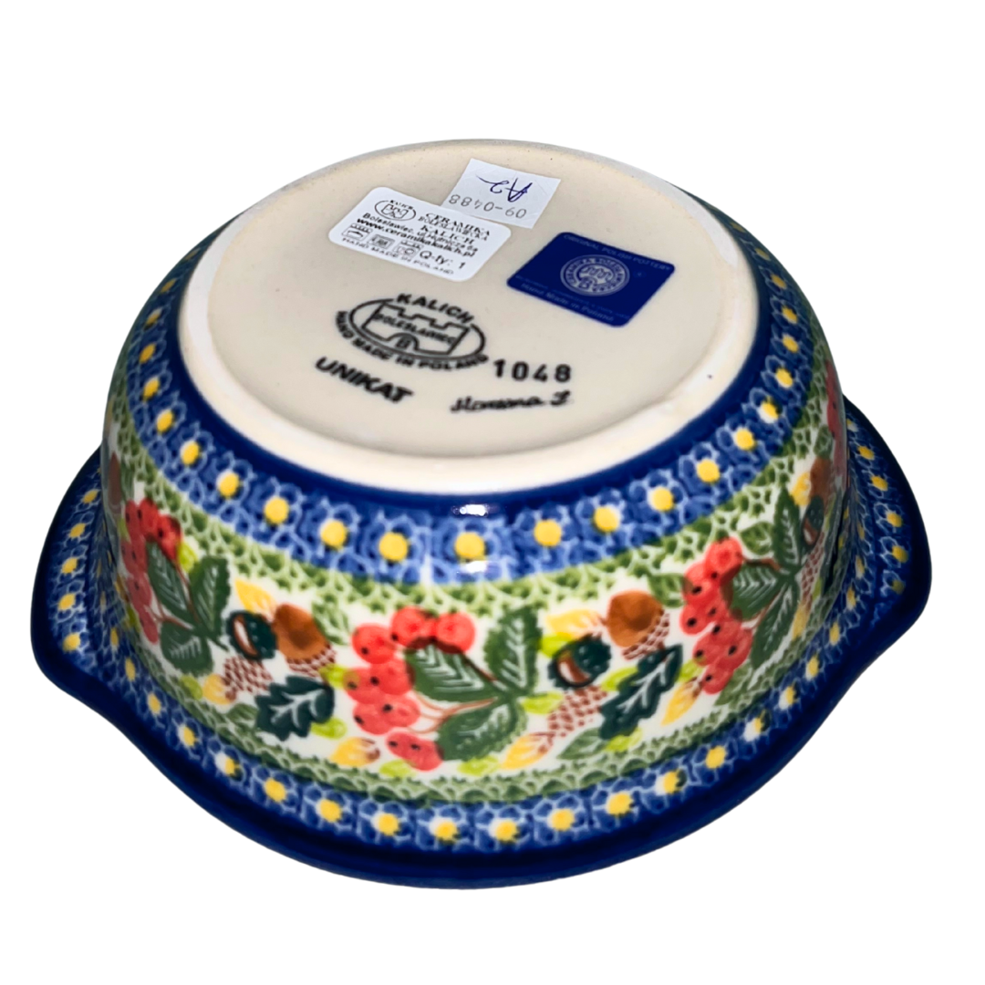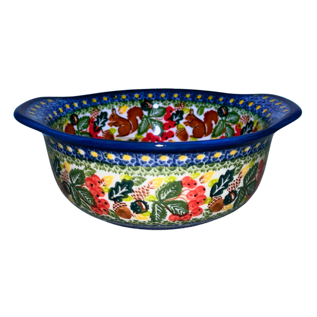 Pattern 1048 – Squirrels and Acorns from Ceramika Kalich is a delightful woodland-inspired design that captures the charm of nature. This handpainted Polish pottery pattern features playful squirrels nestled among clusters of bright red berries, oak leaves, and acorns, framed with a striking blue floral border. The vibrant colors and detailed artistry make this pattern both whimsical and timeless.