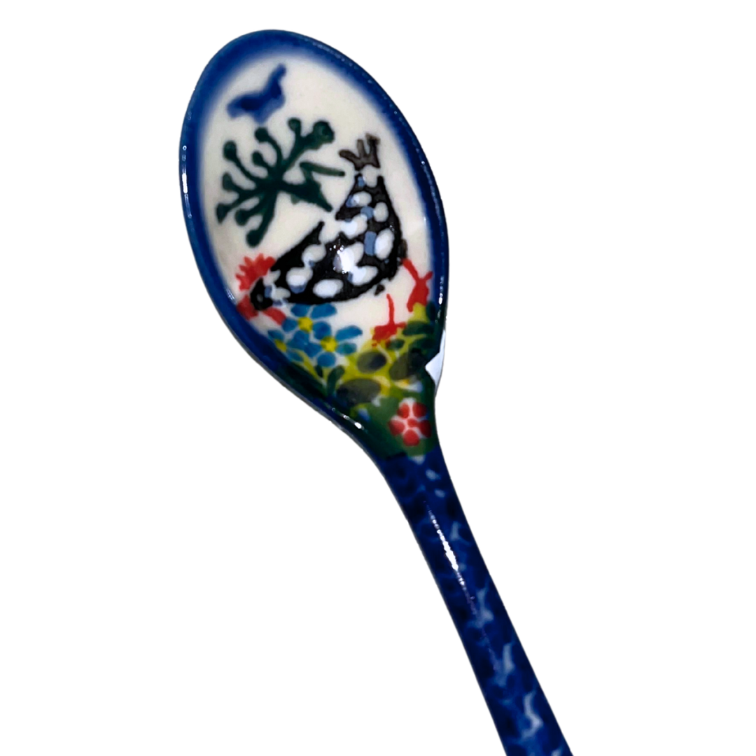 Add a touch of farmhouse charm to your table with Ceramika Kalich Pattern 950 – Polka Chicken. This whimsical Polish pottery design features black-and-white speckled chickens with bright red combs playfully scattered among blooming wildflowers and greenery. Accented by fluttering blue butterflies and a vibrant cobalt blue trim, this hand-painted Unikat pattern is a delightful celebration of countryside life.