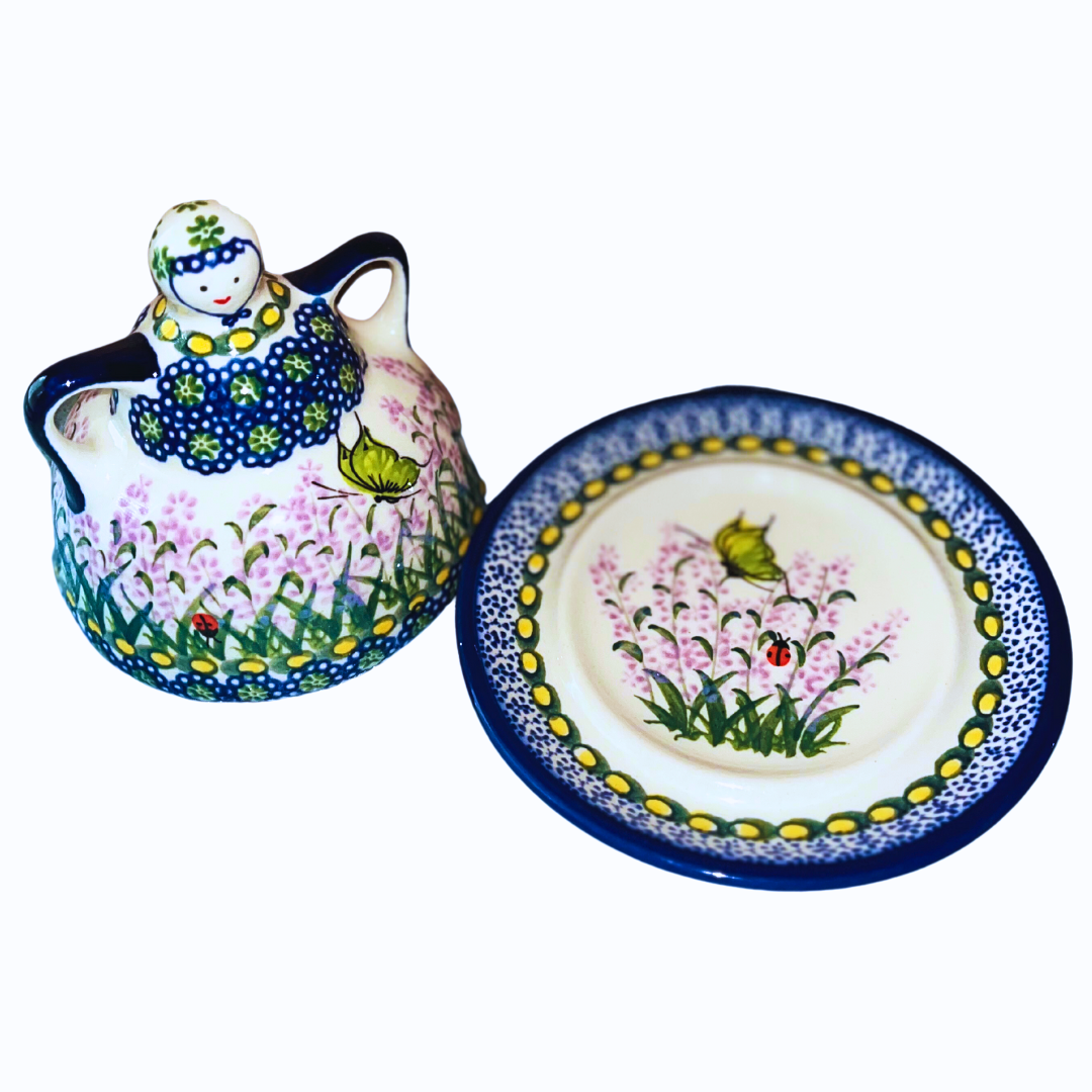 Kalich Polish Pottery Pattern 277, known as Lavender, is a charming hand-painted design featuring soft lavender blooms surrounded by whimsical details of butterflies and ladybugs. The delicate purple florals radiate from the center, accented by shades of green and touches of vibrant blue, orange, and yellow. A bold cobalt rim with a cheerful yellow garland border completes the look, giving this pattern a lively garden feel.